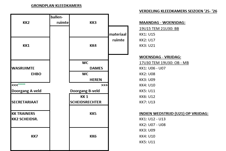 Hieronder vind je de kleedkamerverdeling tijdens trainingen. Op wedstrijddagen wijkt dit af.
